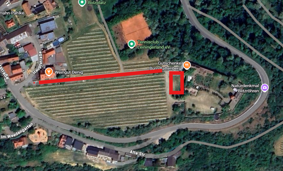 Entlang des Zufahrtsweges zur Burg erstrecken sich am Wegesrand die ersten Parkplätze. Weitere Parkplätze befinden sich direkt vor der Burg. Siehe hierzu die rot markierten Stellen in der rechts aufgezeigten Skizze.